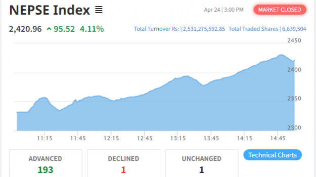 काठमाण्डौ : पछिल्लो समय लगातार ओरालो लाग्दै आएको शेयर बजार आज आइतवार भने उच्च अङ्कले बढेको छ । शेयर बजार परिसूचक नेप्से आज ९५ दशमलव ४६ अङ्कले बढेर दुई हजार चार सय २० दशमलव ९१ विन्दुमा पुगेको छ ।
