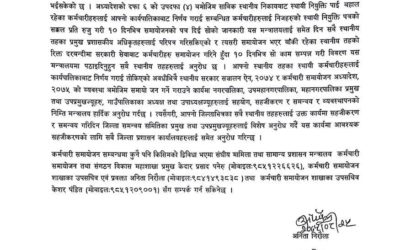 बुधबार, मंसिर २६, २०७५कर्मचारी समायोजनको प्रकृया सुरु, सरुवा नगर्न पत्राचार