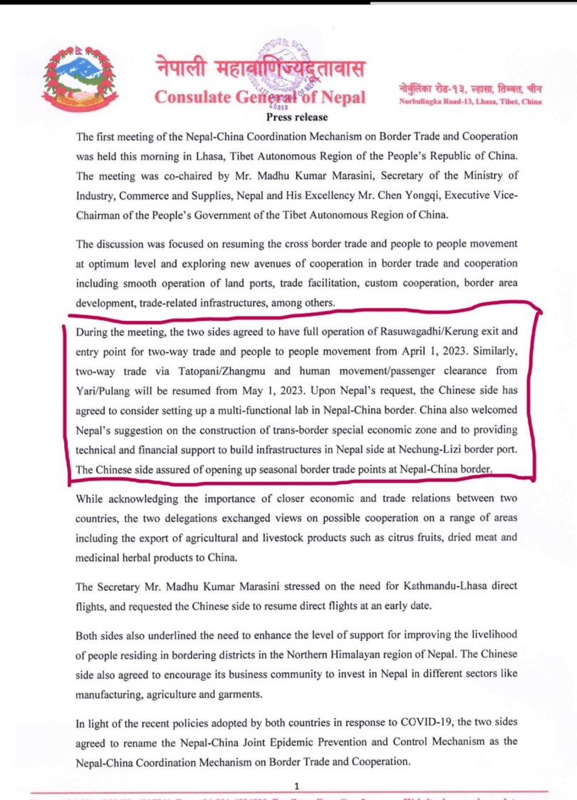 काठमाडौं । नेपाली र चिनियाँ अधिकारीहरुबीच ल्हासामा भएको बैठकपछि तातोपानी नाका चैत्र १८ देखि पूर्ववत सञ्चालनमा आउने भएको छ । दुई पक्षबीच भएको छलफलपछि जारी बिज्ञप्तिमा सो कुरा उल्लेख गरिएको छ । चीनको तिब्बत...